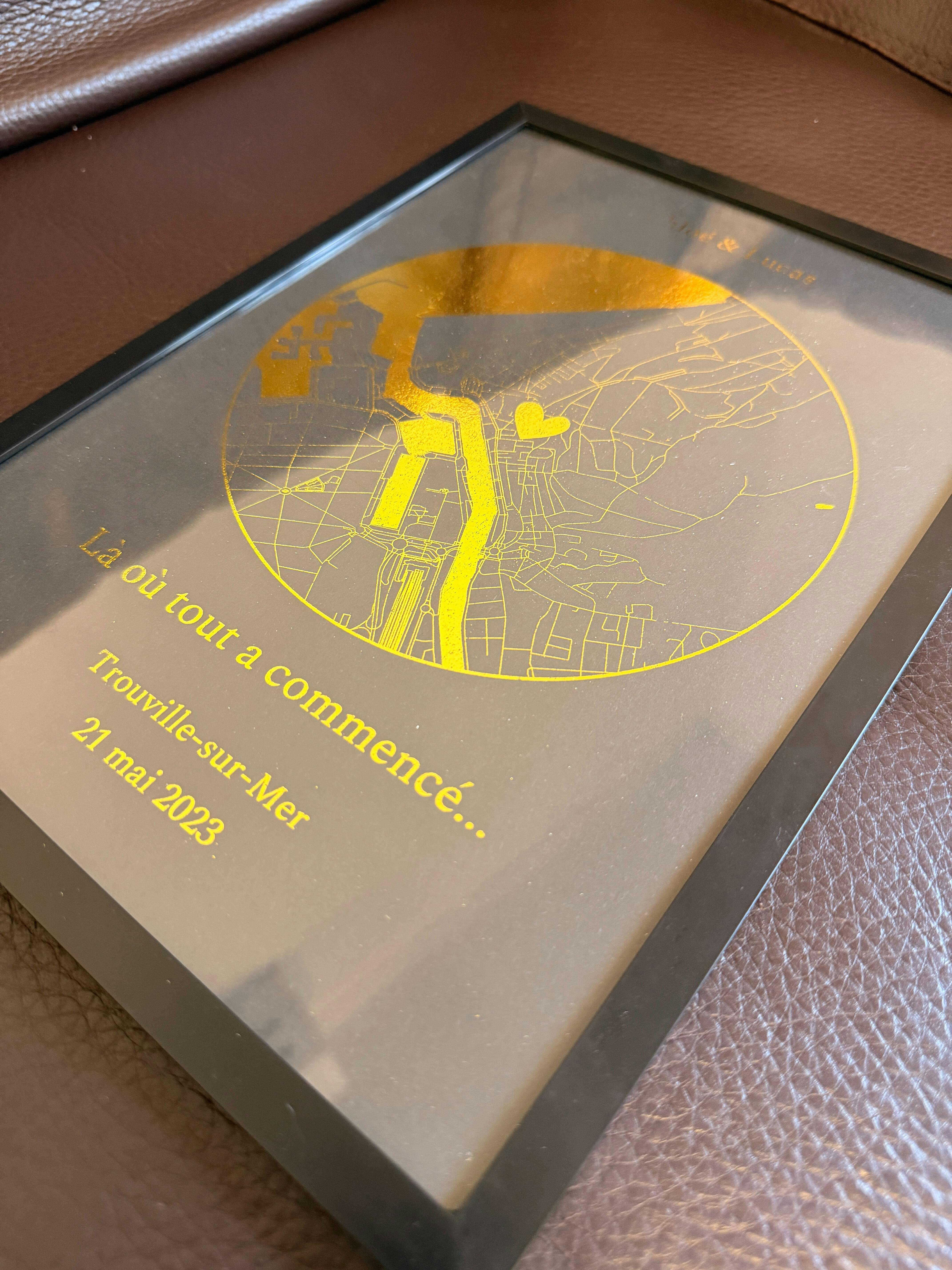 • Personnalisation : Carte du lieu choisi + texte personnalisé (prénom, date, citation, etc.).